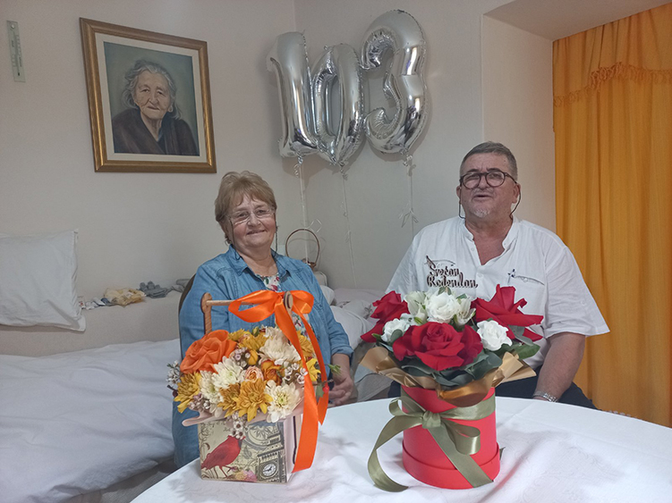 Uz rođendansku pjesmu sa cvijećem i tortom, helijum balonima koji su ispisali 103 – ću godinu života, ušao je Blažo pozdravljajući goste, a Beba joj je predstavljala prisutne, koje je baba Danica prepoznavala i sa njima se pitala.