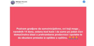 Apel Nebojše Kavarića: Svi koji mogu neka ostanu kući narednih 14...