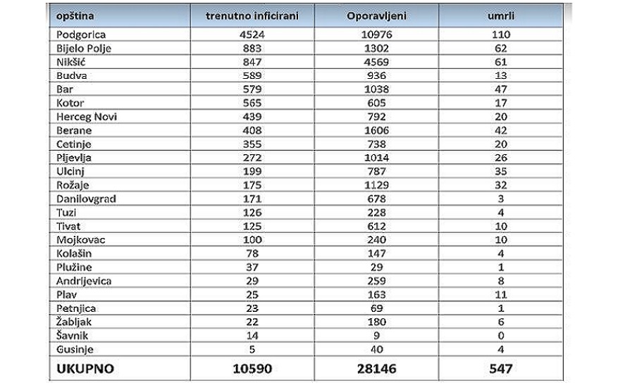 Ukupan broj aktivnih slučajeva COVID-19 u Crnoj Gori trenutno iznosi 10.590.