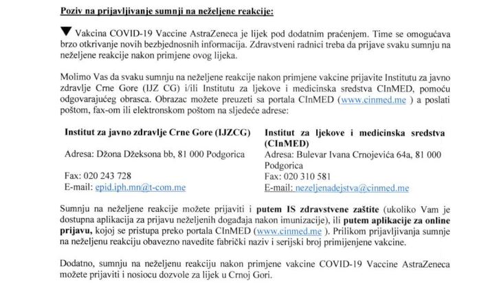 Vakcinisane osobe treba da se obrate ljekaru ako se nakon primjene vakcine pojave simptomi kao što su nedostatak daha, bol u grudima, oticanje nogu i perzistentan bol u abdomenu. Uz to, sve osobe kod kojih se nakon primjene vakcine pojave neurološki simptomi, uključujući teške ili perzistentne glavobolje i zamućen vid, kao i one kod kojih se nekoliko dana nakon vakcinacije pojave modrice ili tačkasta krvarenja na koži (petehije) udaljene od mjesta primjene vakcine, moraju odmah potražiti pomoć ljekara”, ističe Glosarij i Institut za ljekove i medicinska sredstva.