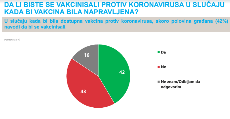 Gotovo svaki drugi građanin Crne Gore (42 odsto) vakcinisao bi se protiv koronavirusa kada bi vakcina bila dostupna.