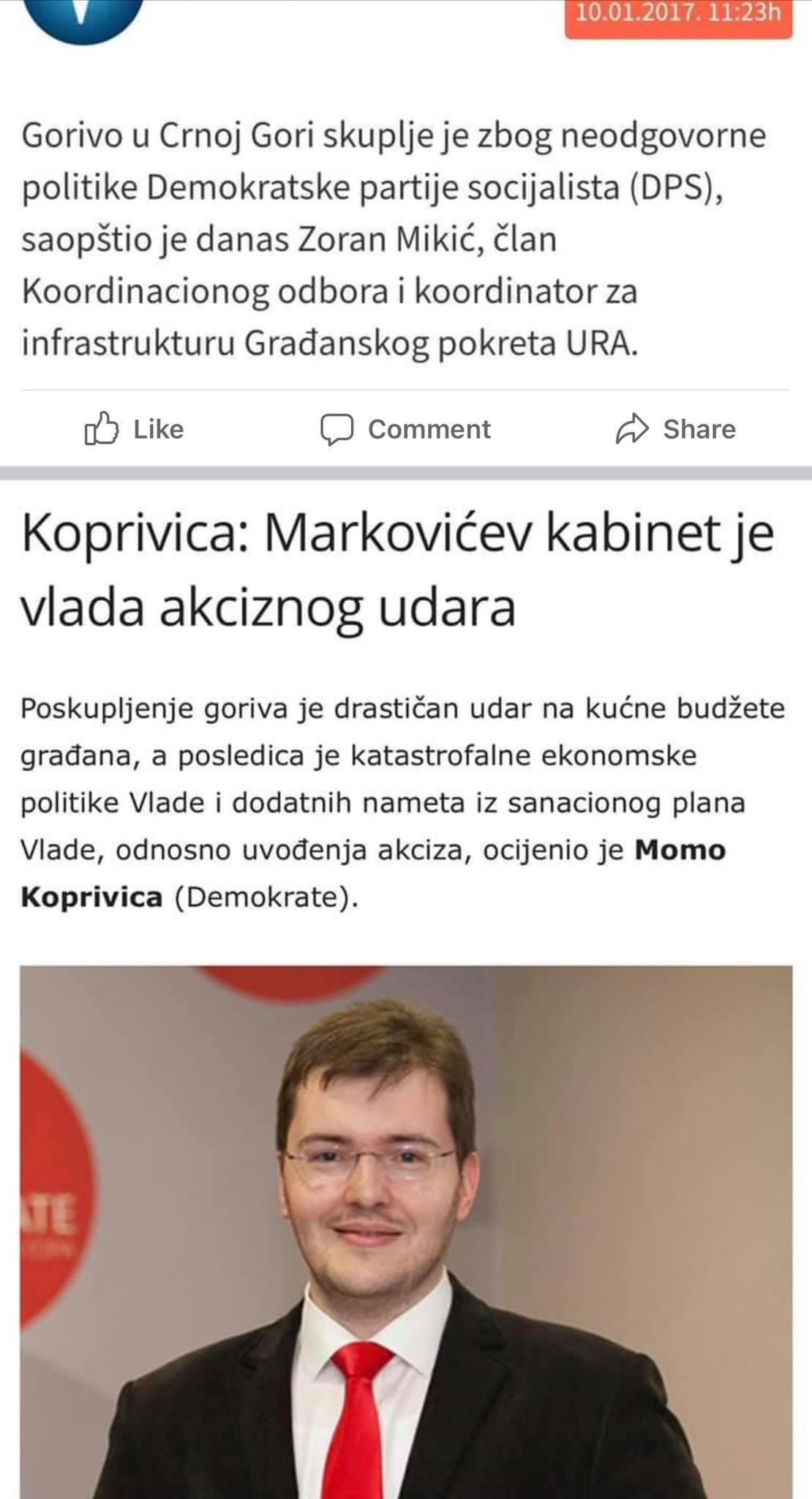 Funkcioner GP URA Zoran Mikić, partije koja je danas na vlasti, je 2017. godine govorio da je gorivo sve skuplje zbog neodgovorne politike Demokratske partije socijalista.