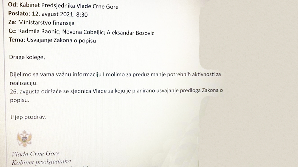 “Dijelimo sa vama važnu informaciju i molimo za preduzimanje potrebnih aktivnosti za realizaciju. Dvadeset šestog avgusta održaće se sjednica Vlade za koju je planirano usvajanje predloga Zakona o popisu”, stoji u mailu premijerovog kabineta upućenom Ministarstvu finansija.