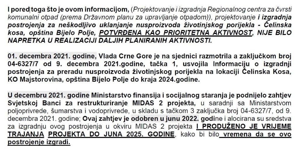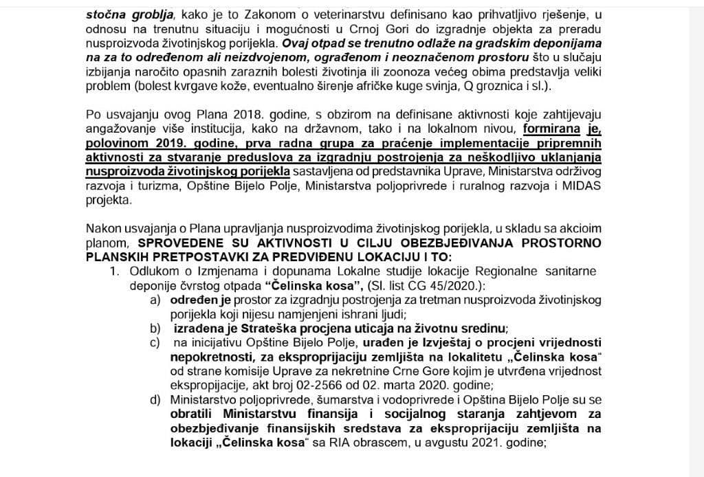 „Prvog decembra 2021. godine, Vlada Crne Gore je na sjednici razmotrila a zaključkom broj 04-6327/7 od 9. decembra 2021. godine, tačka 1, usvojila informaciju o izgradnji postrojenja za preradu nusproizvoda životinjskog porijekla na lokaciji Čelinska kosa, KO Majstorovina, opština Bijelo Polje do kraja 2024. godine“.