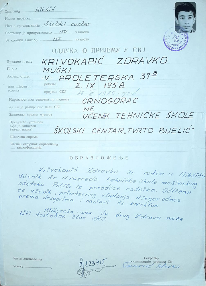 Zdravko Krivokapić, kako svjedoči njegova partijska dokumentcija (koja se, kao i svi partijski dosijei čuva u Državnom arhivu Crne Gore), primljen je u SKJ 17. marta 1976. godine, kao sedamnaestogodišnji, odličan učenik trećeg razreda Tehničke škole „Tvrtko Bijelić“ u Nikšiću.