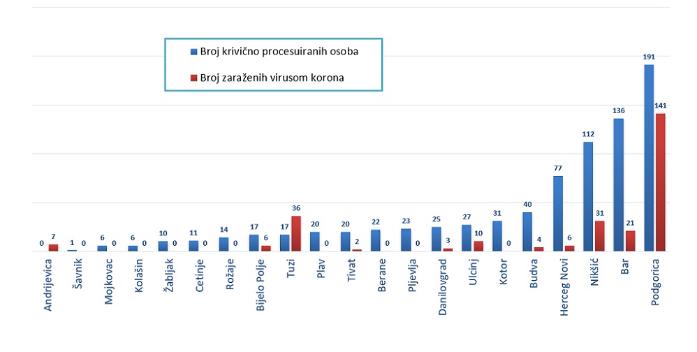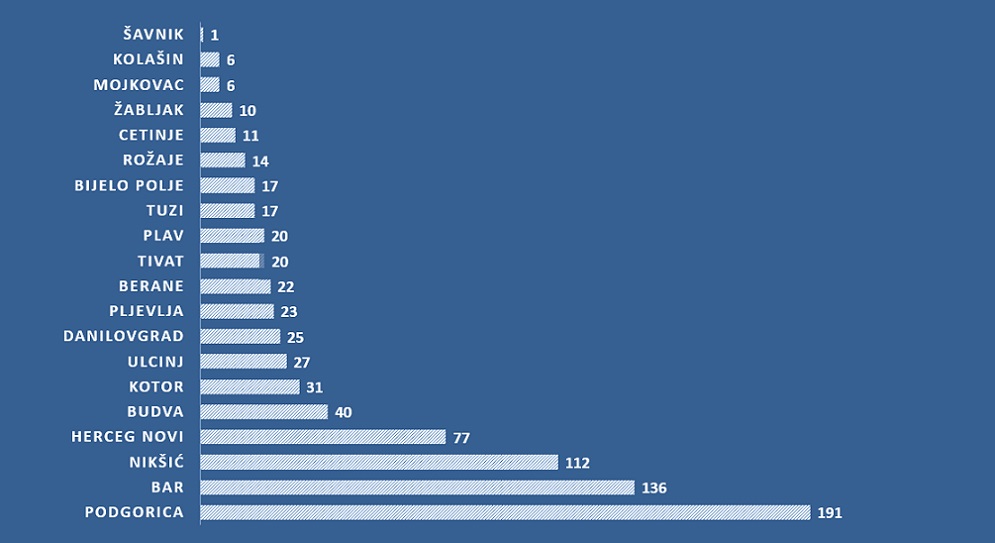 U Baru je zabilježeno 136, Nikšiću 112, Herceg Novom 77, Budvi 40, Kotoru 31 prekršaj.