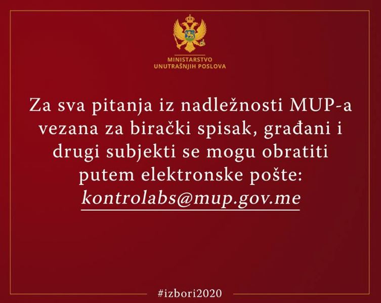 Iz Ministarstva unutrašnjih poslova pozvali su građane i druge zainteresovane subjekte da se za sva pitanja u vezi sa biračkim spiskom obrate putem elektronske pošte: [email protected].