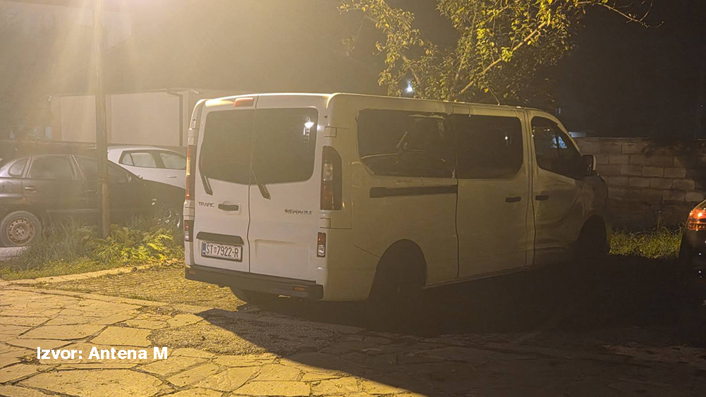 Ispred policijske stanice nalazi se kombi splitskih tablica sa vidnim polomjelnim staklima i drugim oštećenjima.