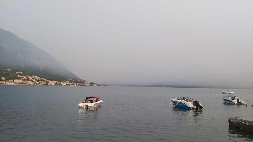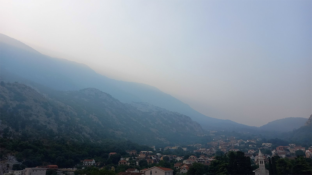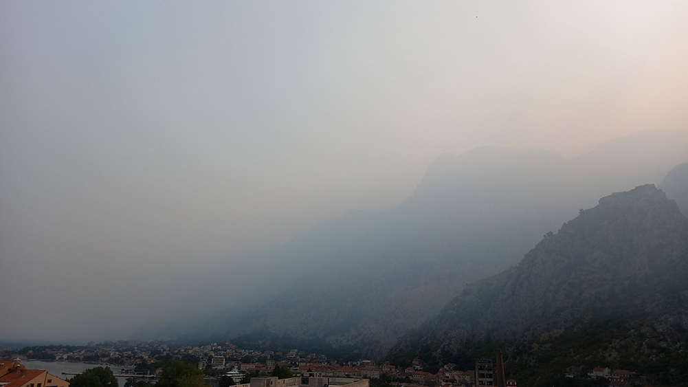 Sunce se jutros ne vidi u Kotorskom zalivu. Umjesto vedrog neba stanovnici drevnog grada i brojni gosti udišu čestice dima od požara koji se proširio na teritoriji cetinjske opštine.