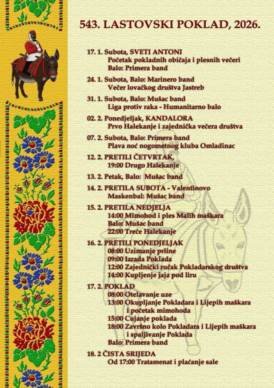 Tradicija poklada se i danas održava na otoku Lastovu i slićna je običaju iz Perasta opisanog 1715. godine. Naziva se POKLAD. Kao i svakog siječnja, i ovog se na Lastovu održava 543. Lastovski poklad, jedan od najuzbudljivijih događaja na otoku Lastovu. Poklad počinje na svetog Antoneta (sv. Antuna pustinjaka) 17. siječnja i traje do 17.02.2026. godine. Lastovski poklad je u prosincu 2025. godine uvršten na UNESCO-ovu listu dobrih praksi očuvanja nematerijalne kulturne baštine svijeta, kao jedinstveni pokladni običaj tradicijske kulture Lastova.