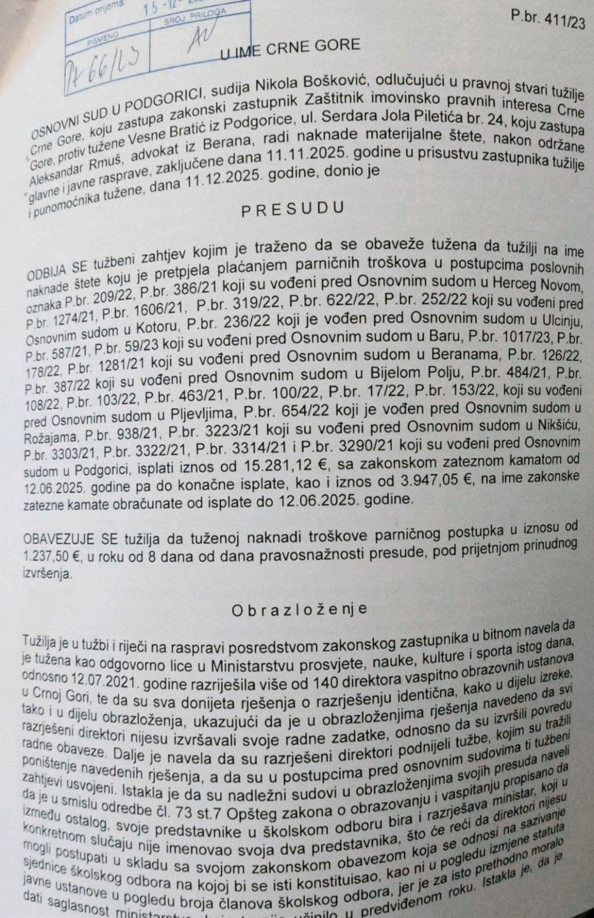 – Za naglasiti je da je sud posebno cijenio i isticanja tužilje da se namjera ili krajnja nepažnja tužene ogleda u činjenici što je predmetne prilike razriješila i umrlo lice, ali ti navodi nisu bili od uticaja na drugačije presuđenje. Naime, tužena kao ministar svakako nije sama pripremala sporna rješenja, niti je imala obavezu da provjerava tačnost podataka koji egzistiraju u rješenjima koje je potpisivala. Navedeno je bila obaveza drugih lica zaposlenih u ministarstvu, odnosno onih koji su pripremali rješenja – piše u presudi u koju je Pobjeda imala uvid.