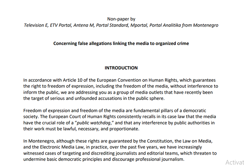 -Zbog toga ovaj Non-pejper ima za cilj da upozori evropske institucije na zabrinjavajuće prakse targetiranja medija i novinara u Crnoj Gori, da ukaže na sistemske slabosti koje omogućavaju zloupotrebu moći, spregu Specijalnog državnog tužilaštva, politike i određenih medija, te da predloži mjere koje bi osigurale puno poštovanje člana 10 Evropske konvencije, kao i međunarodnih standarda slobode medija i izražavanja. Posebno ukazujemo na pretpostavku nevinosti kao jedno od osnovnih ljudskih prava, koja je u ovom slučaju grubo prekršena činjenicom da je dio crnogorskih političara uz pomoć jednog medija pokušao da igra ulogu tužioca i sudije, da i prije optužnice označi krivce, te da ućutka glas medija koji kritički izvještavaju o vlasti – ocjenjuje se u Non pejperu šest crnogorskih medija.