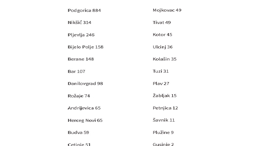 Ukupno je dijagnostikovan 161 novopozitivni slučaj infekcije SARS-CoV-2, i to iz: Podgorice 45, Nikšića 24, Pljevalja 21, Bijelog Polja 13, Berana 12, Bara 9, Cetinja 6, Herceg Novog 4, Budve, Kotora, Rožaja, Ulcinja, Tuzi, Kolašina i Žabljaka po 3, Mojkovca i Petnjice po dva, a po jedan iz Tivta i Danilovgrada.