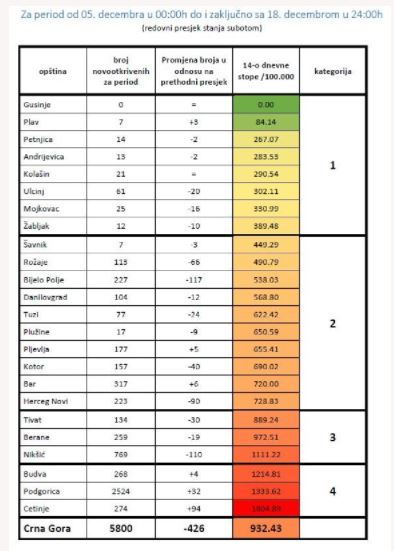 “Na osnovu svih registrovanih slučajeva obolijevanja u periodu od subote 5. decembra do ponoći i zaključno sa petkom 18. decembrom 2020. u 24:00 h, izračunate su vrijednosti 14-dnevnih opštinskih stopa kumulativne incidencije za navedeni period i sačinjena je lista opština”, objavljeno je na sajtu IJZ.