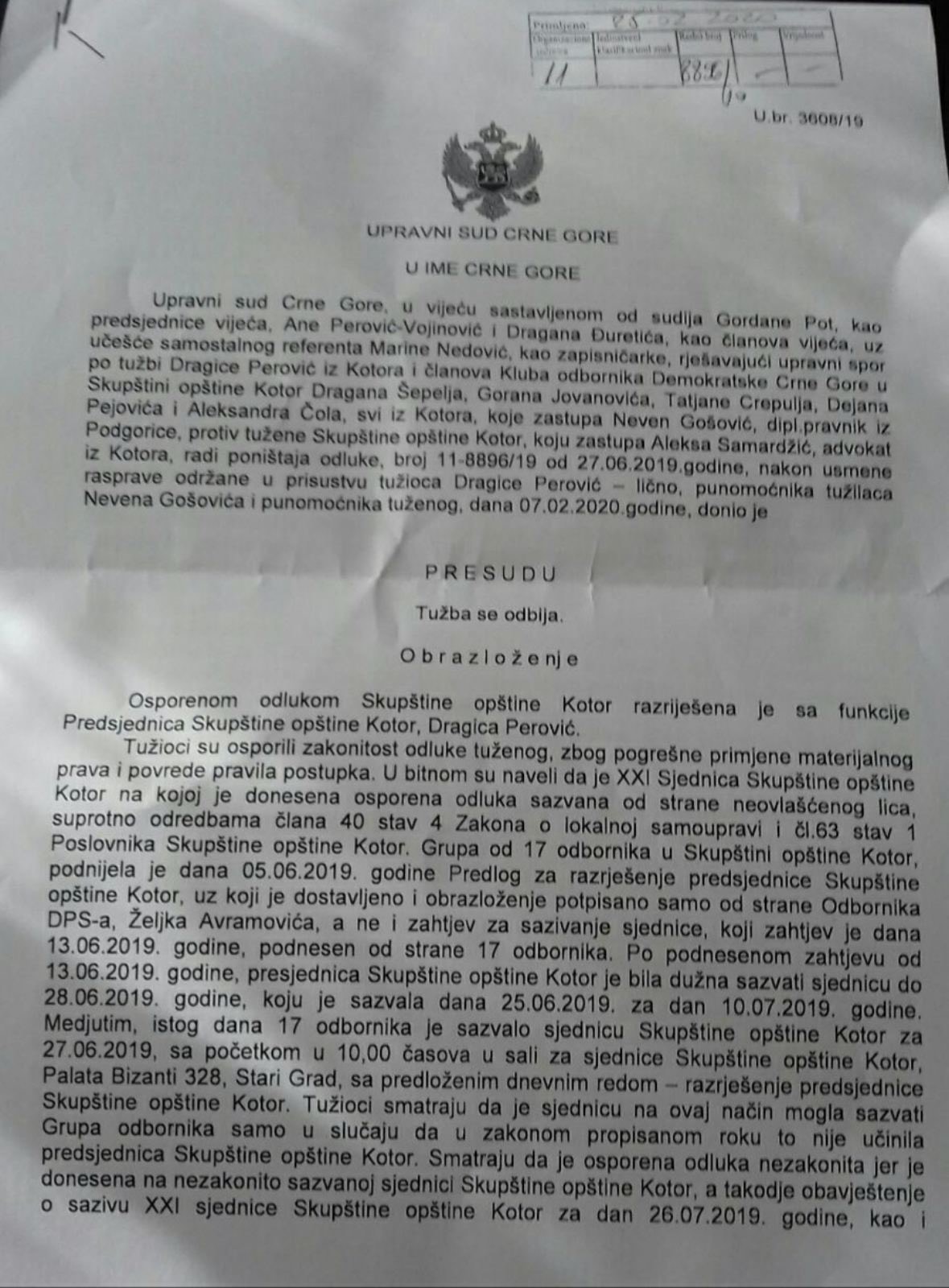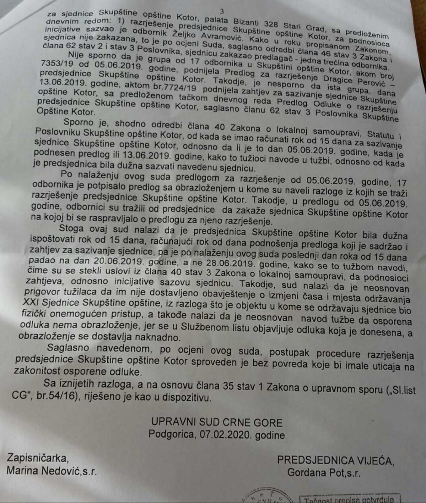 Sud nije našao da je sporno da je sjednica SO 27. 06.2019. godine sazvana od strane jedne trećine odbornika, kao ni činjenica da je tadašnja predsjednica Perović razriješena na zakonit način. Jedna trećina odbornika SO Kotor je 25. 06. 2019. godine sazvala Supštine opštine, koja je dva dana kasnije održana u skupštinskoj sali palate Bizanti. Nova skupštinska većina koju čine odbornici DPS-a, SD-a, LP-a, HGI-ja i odbornica SDP-a Bruna Lončarević smijenila je tadašnju predsjednicu Dragicu Perović. Za odluku je glasalo 17 odbornika, isti broj kojim je dvije godine ranije izabrana na tu funkciju.