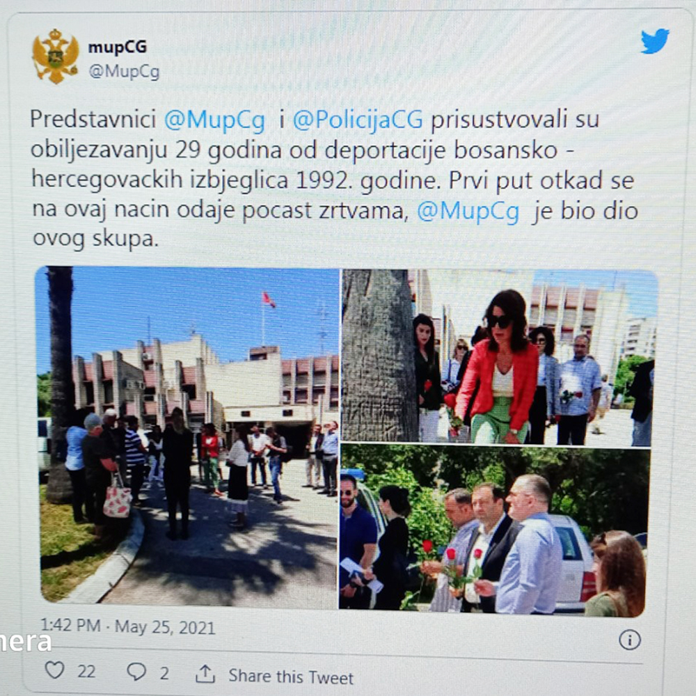 Predstavnici Ministarstva unutrašnjih poslova i Uprave policije prisustvovali su obilježavanju 29 godina od deportacije bosansko-hercegovačkih izbjeglica 1992. godine. I to je informacija koja je tačna. Ali ona u nastavku ove kratke vijesti objavljene na tviter nalogu MUP-a ne da nije tačna nego je čista isfabrikovana laž, kazali su portalu Radio Skala iz dobro obaviještenih krugova.