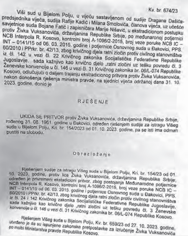 Iz Višeg suda u Bijelom Polju navedeno je da je 31. oktobra Ministarstvo pravde Crne Gore dostavilo Višem sudu rješenje ministra pravde od 27. oktobra, kojim se odbija molba Ministarstva pravde Republike Kosovo za izručenje Vuksanovića, radi vođenja krivičnog postupka zbog krivičnog djela ratni zločin protiv civilnog stanovništva.